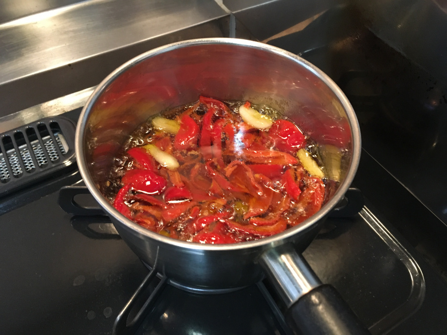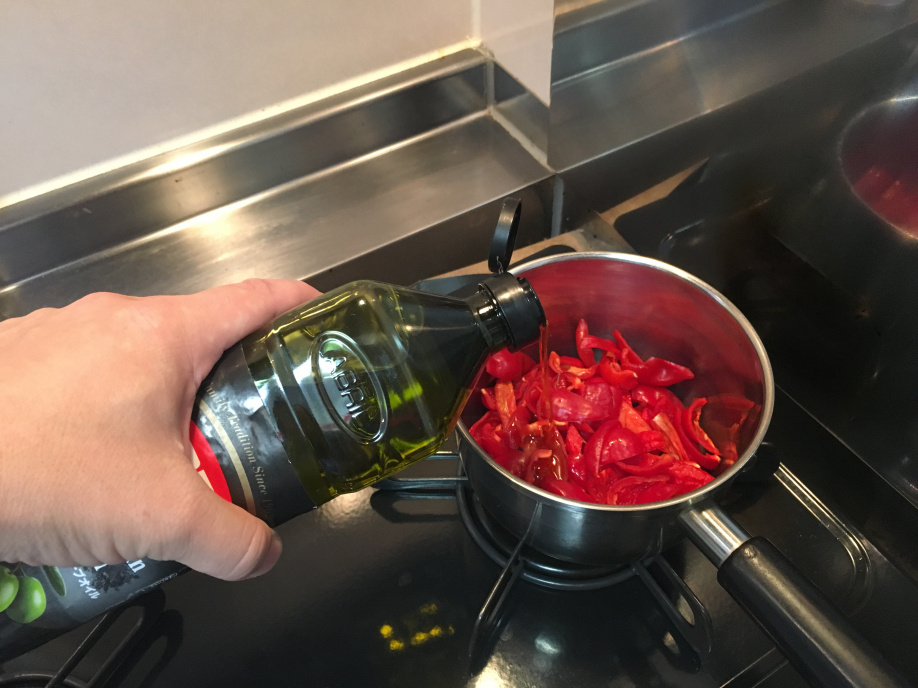 それを鍋に入れて,さらにスライスしたニンニクを数かけら入れて,最後にオリーブオイルを投入して,火にかけ辛味を抽出してきます。